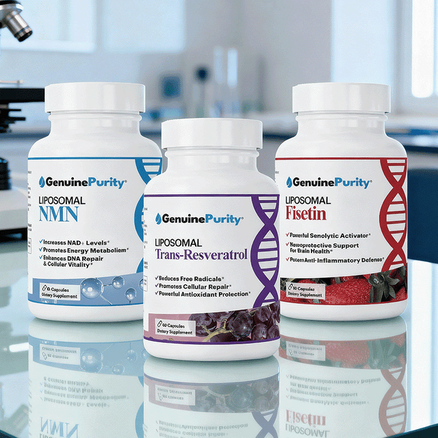 This powerful 3-product bundle is designed to support your body’s natural longevity systems from multiple angles. Liposomal NMN helps replenish NAD+—the essential molecule involved in over 500 cellular processes, including energy production and DNA repair. Liposomal Trans-Resveratrol provides comprehensive vascular and cognitive support with a highly bioavailable antioxidant formula. Liposomal Fisetin delivers targeted senolytic support to help clear aging “zombie” cells that can accumulate over time and impact healthy function.